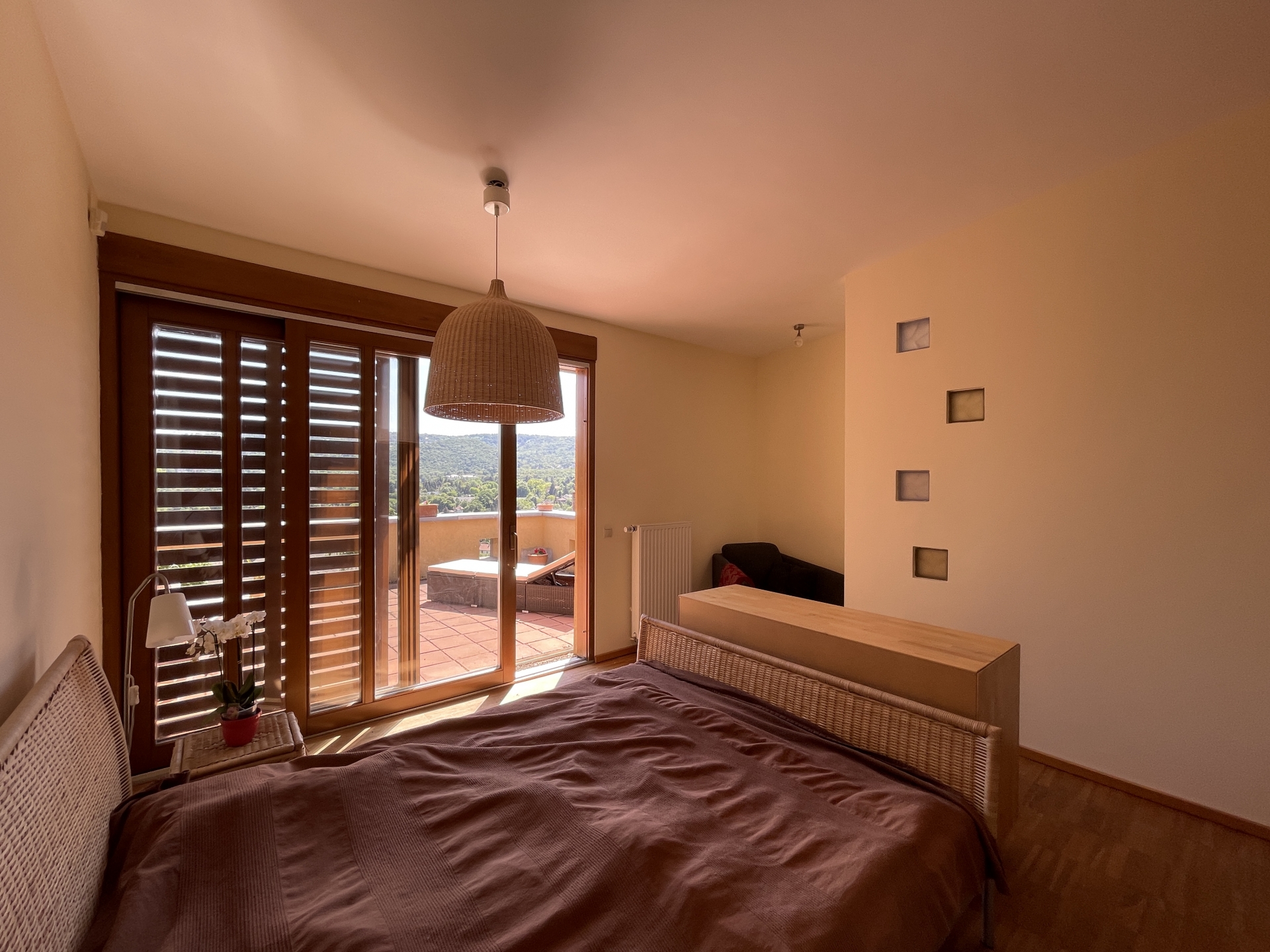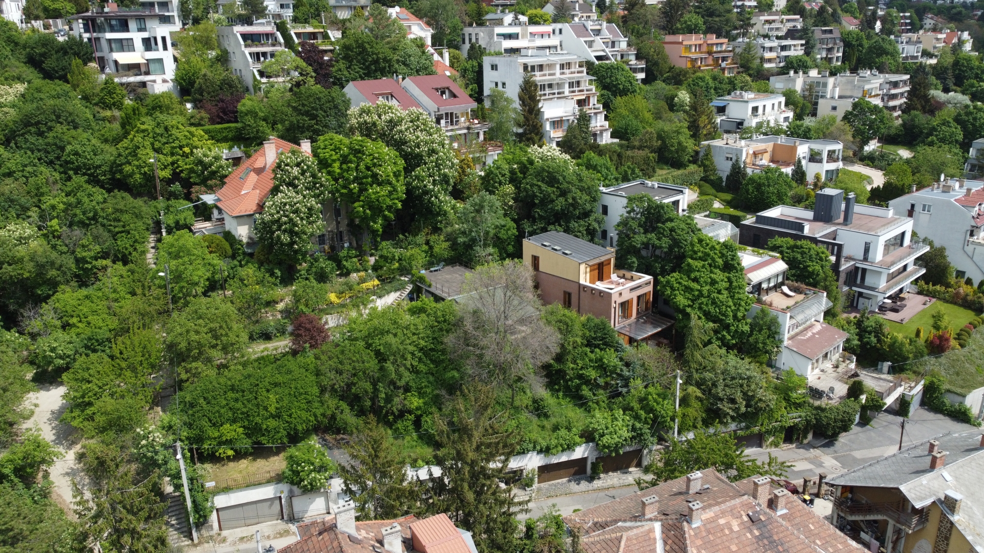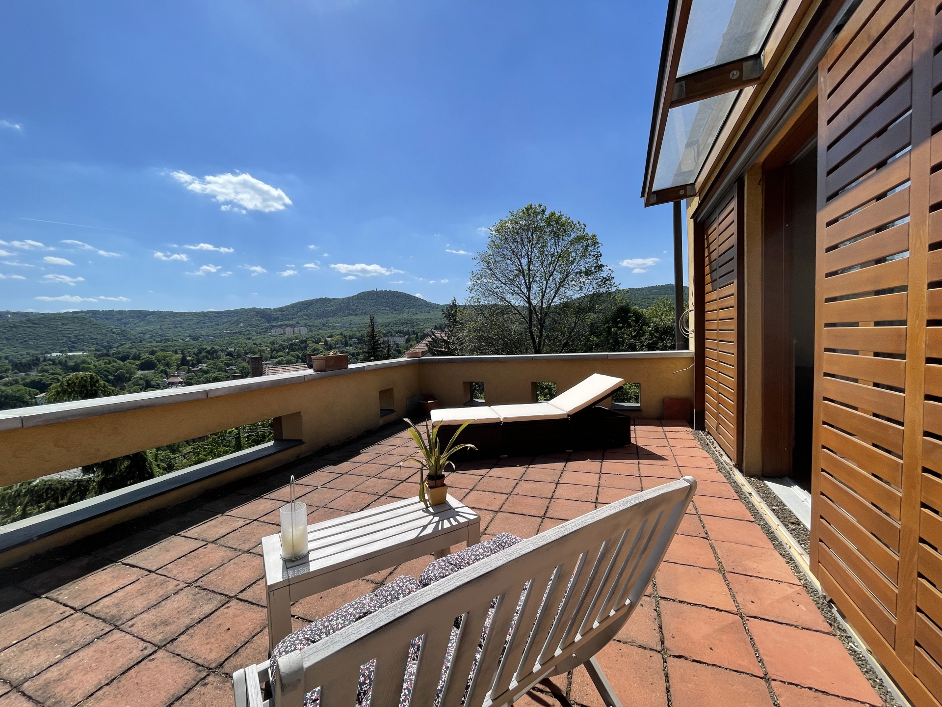 A ház elhelyezkedésének köszönhetően a nyugalom szigete, zöld környezet közvetlen a ház körül és kinézve az ablakokon is, csendes csak a madárcsicsergés hallható. A teraszokról csodálatos és elvehetetlen a panoráma, az alsó teraszról a pasaréti templom és körszálló látható míg a felső teraszról a Budai parkerdő csodás látványa tárul elénk. Napnyugtával minden nap megcsodálhatjuk a naplementét, sötétedés után pedig Buda fényeit akár a teraszról vagy az ágyból.