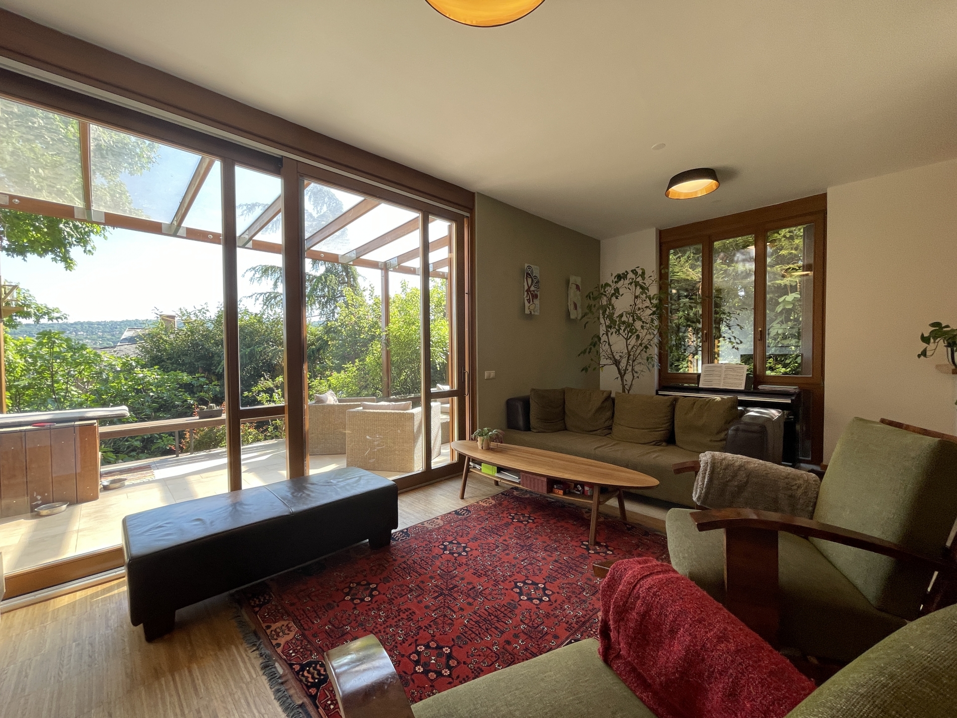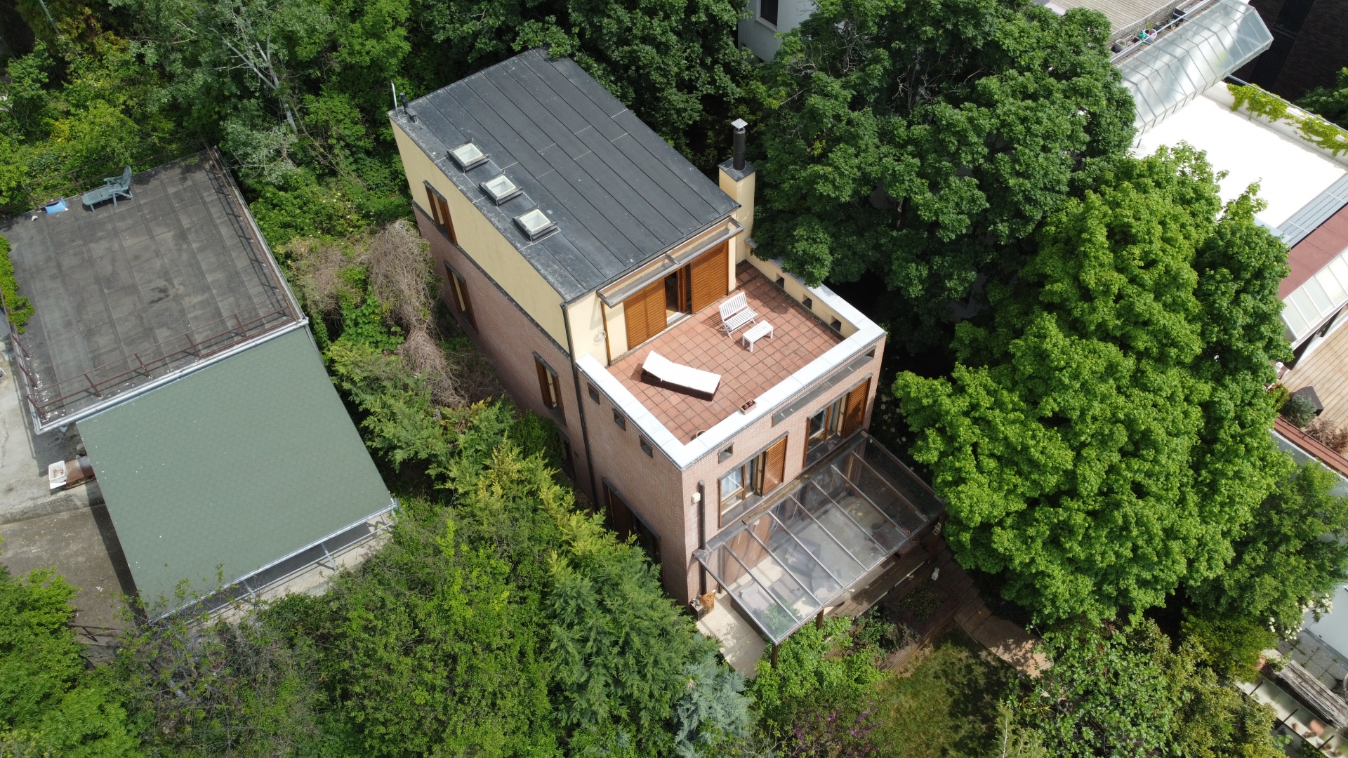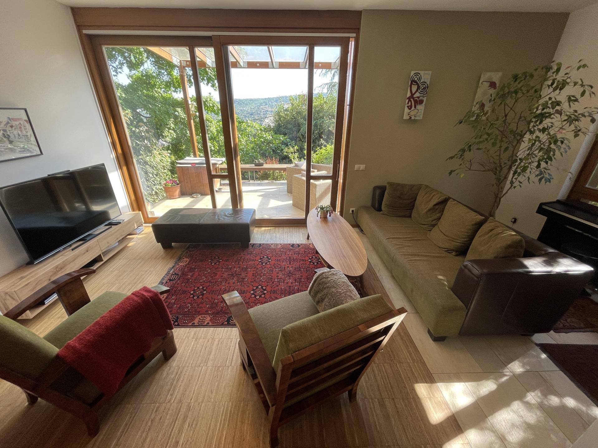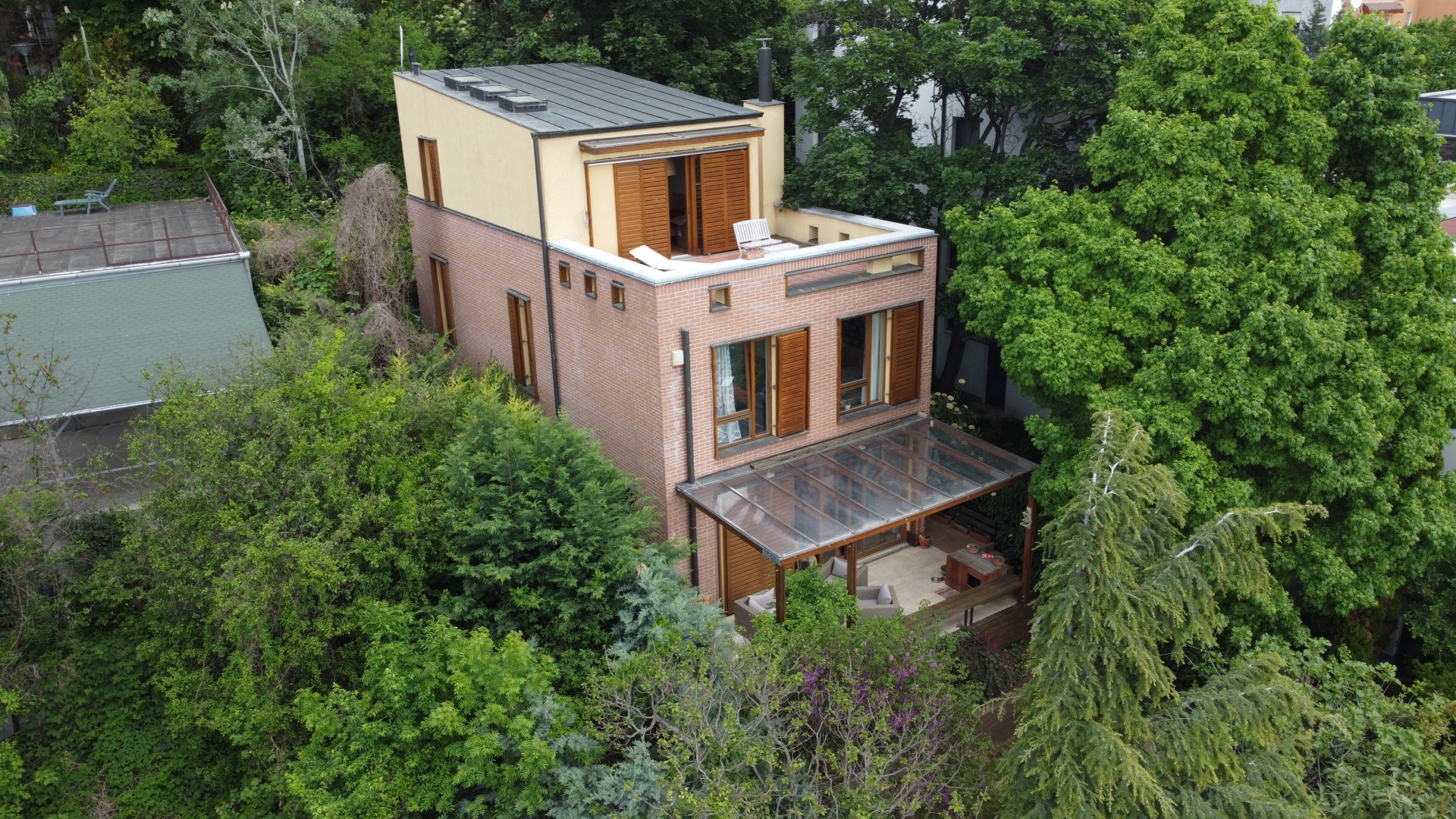 A ház elhelyezkedésének köszönhetően a nyugalom szigete, zöld környezet közvetlen a ház körül és kinézve az ablakokon is, csendes csak a madárcsicsergés hallható. A teraszokról csodálatos és elvehetetlen a panoráma, az alsó teraszról a pasaréti templom és körszálló látható míg a felső teraszról a Budai parkerdő csodás látványa tárul elénk. Napnyugtával minden nap megcsodálhatjuk a naplementét, sötétedés után pedig Buda fényeit akár a teraszról vagy az ágyból.