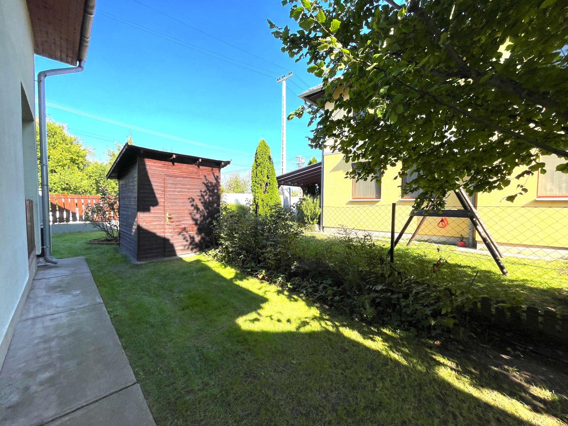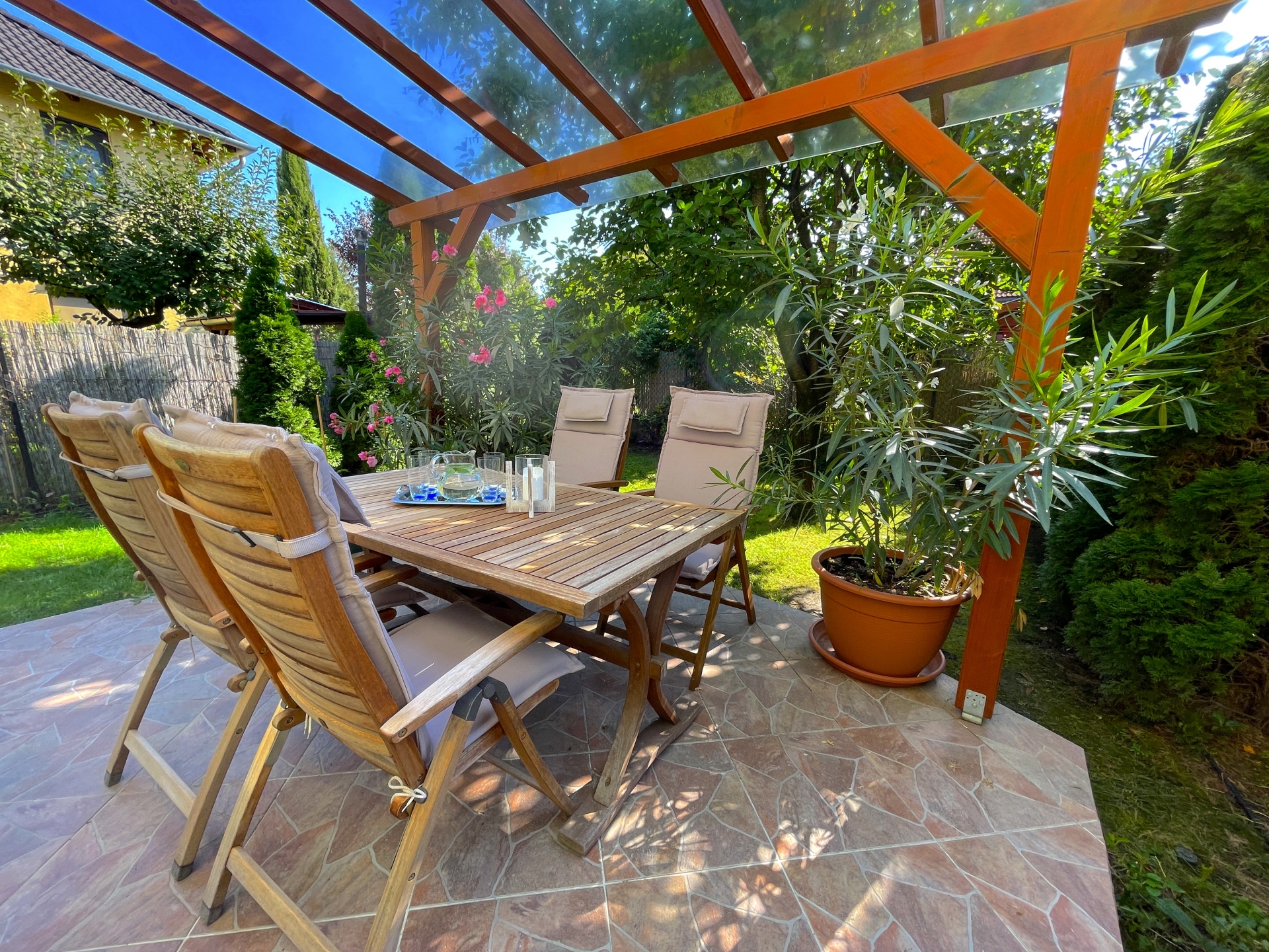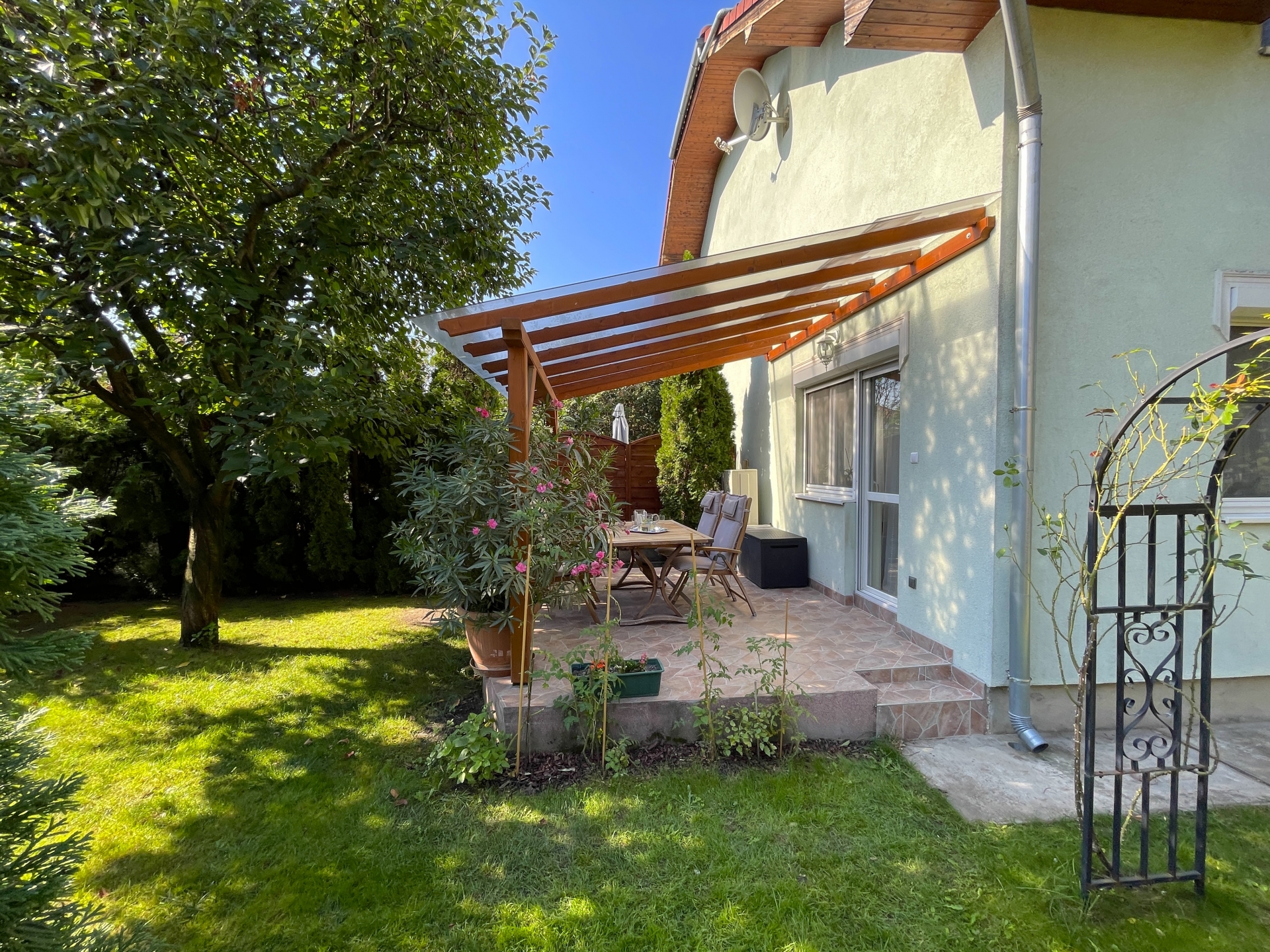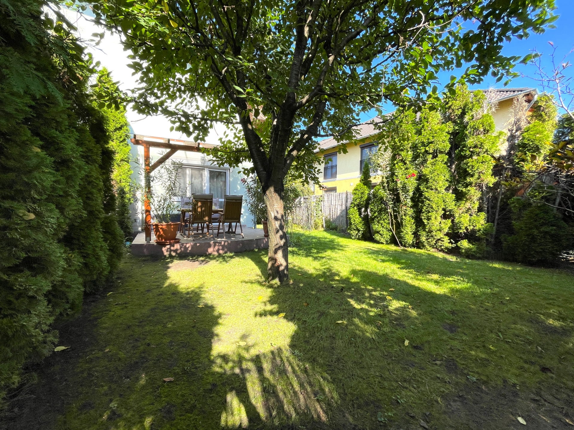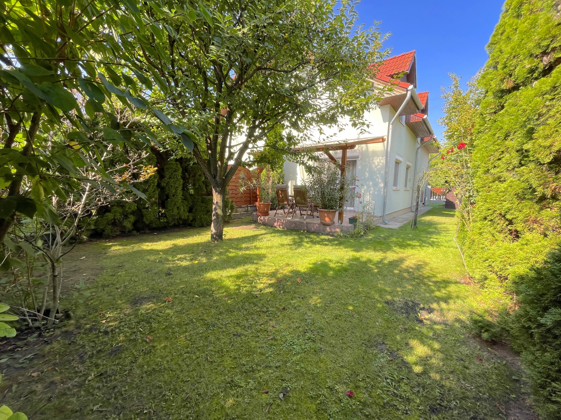 A hátsó kert intim játékteret kínál a gyerekek számára, melyet a konyhából is átláthat. Terasz méret 12,5 m2 melyet igényes fa szerkezeten UV szűrős polikarbonát tető véd. Az oldalkertben bogyós gyümölcsös (málna, eper, ribizli, szeder) és törökmogyoró bokor található, míg a hátsó kertben egy meggyfa ékesíti az udvart. Telek méret: 278 m2.