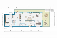 A földszinten található hatalmas élettér a közösen együtt töltött időhöz lett kialakítva, így egy térben mégis a szükséges mértékben elválasztva kapcsolódik a konyha és az étkező valamint a nappali és a terasz teljes összhangban. Ebben a konyhában a főzés nem egy magányos tevékenység, az sem szorul ki a közösségi életből aki épp a konyhában tevékenykedik. A földszinten található még egy nem túl nagy, de a szükséges mértékig tágas előszoba beépített szekrénnyel és cipő tárolóval egy kézmosós WC és a háztartási helyiség melyben a gépészet (kombi kazán 300 literes készenléti melegvíz tárolóval, központi porszívó, mosógép, mosdó) kapott helyet és nagyméretű tárolóként funkcionál.