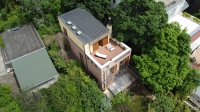 Az épület földszint + 2 emeletes. A beépítés igazodik a közvetlen környezetében található szabadon álló családi házas és társasházas telkek beépítéséhez. Az utca felől, a támfalban 2 autó számára támfalgarázs és fedett bejárat kukatárolóval épült. A garázs tetejét az épület kertjéhez kapcsolódó intenzív zöldtetőként alakították ki. Az utca szintjéről jutunk az épület szintjére, az előkert mérete kb. 10 m. Az előtetővel fedett lakásbejárat a földszint keleti oldalán az oldalkertből nyílik. Az előtérből nyílóan kamra, gardrób, háztartási helyiség, vendég WC található. Innen közelíthető meg a nappali szoba, a konyha és az étkező. A nappalihoz déli tájolású fedett terasz kapcsolódik. A földszinti előtérből nyíló lépcsőn érhető el az 1. emelet, ahol 3 hálószoba, fürdő, külön WC található. A szint közlekedő teréből lépcső vezet a 2. emeletre, itt egy nagyméretű tetőteraszos hálószoba, dolgozósarok és fürdőszoba készült.