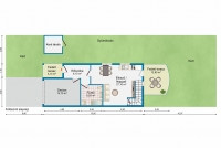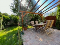 A hátsó kert intim játékteret kínál a gyerekek számára, melyet a konyhából is átláthat. Terasz méret 12,5 m2 melyet igényes fa szerkezeten UV szűrős polikarbonát tető véd. Az oldalkertben bogyós gyümölcsös (málna, eper, ribizli, szeder) és törökmogyoró bokor található, míg a hátsó kertben egy meggyfa ékesíti az udvart. Telek méret: 278 m2.