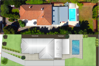 Az alsó szint padlószintje egy szinten van a tereppel, itt található a 2 autó beállására alkalmas garázs, a gépészeti rész és tárolók, valamint egy fürdő és az 50 m²-es télikert, egy 30 m²-es fedett terasz beépített ülőhelyekkel és kültéri főzőhellyel, melyhez közvetlen kapcsolódik a 8x4 méteres feszített víztükrű, ellenáramoltatós úszómedence és egy sík, kb. 200 m²-es füves terület, amely ideális sportolásra vagy szabadidős tevékenységekre.